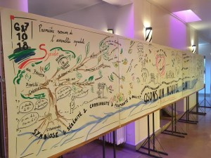 Une technique de facilitation graphique a aussi rendu visible le travail collectif. Il y avait en effet un écueil important dû aux contraintes pratiques de la première session: les 13 commissions devaient travailler pendant deux jours complets dans des salles différentes, ne se rencontrant que pour les pauses, les repas et les partages des consignes en début et fin de journée.