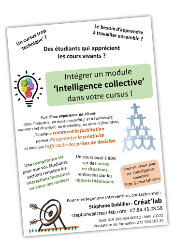 Auprès d’étudiants ou pour vos collaborateurs, je vous propose une formation de 3 jours pour découvrir la facilitation, comprendre les concepts mis en jeu, et apprendre à concevoir et animer un atelier collaboratif.